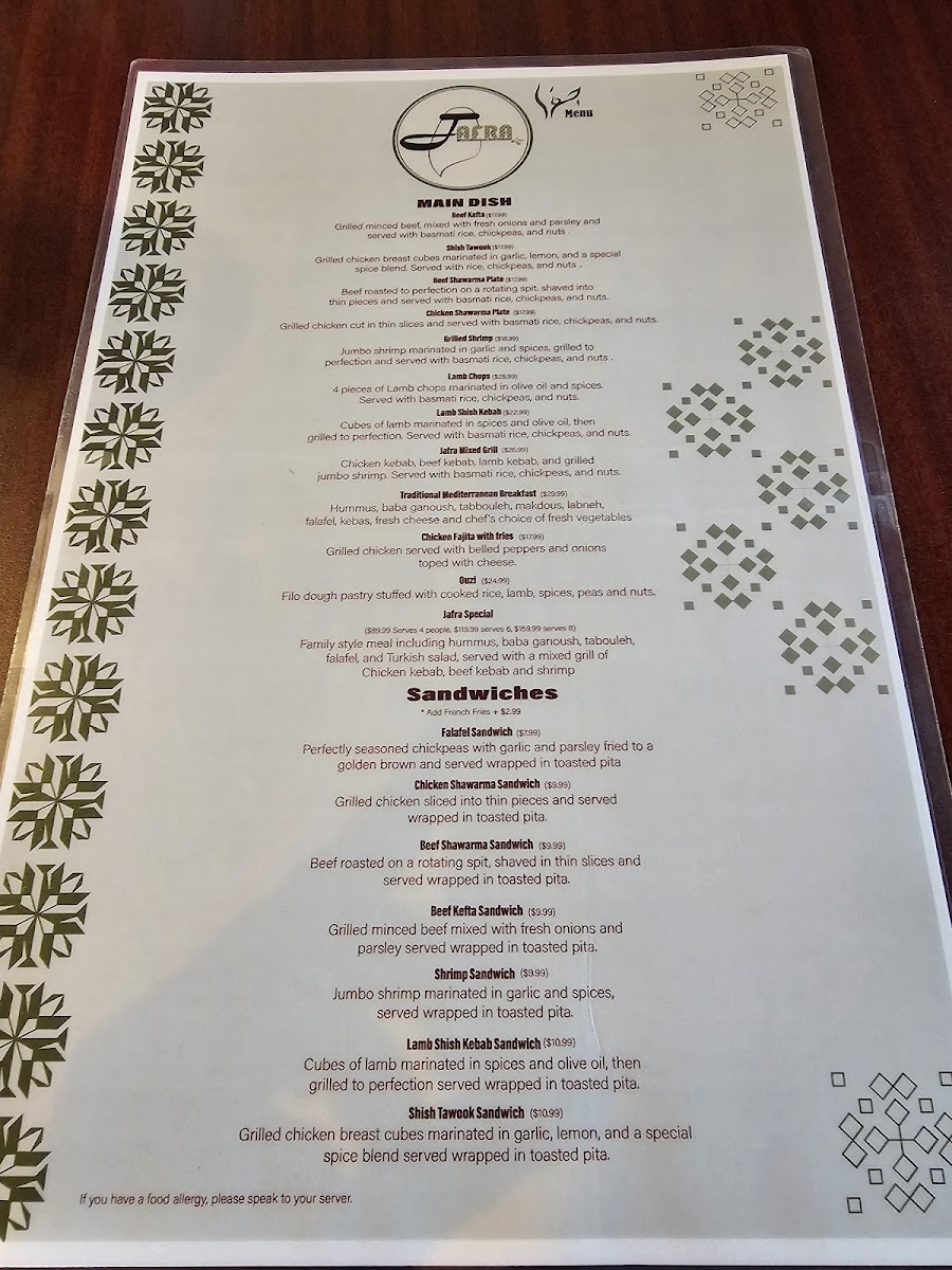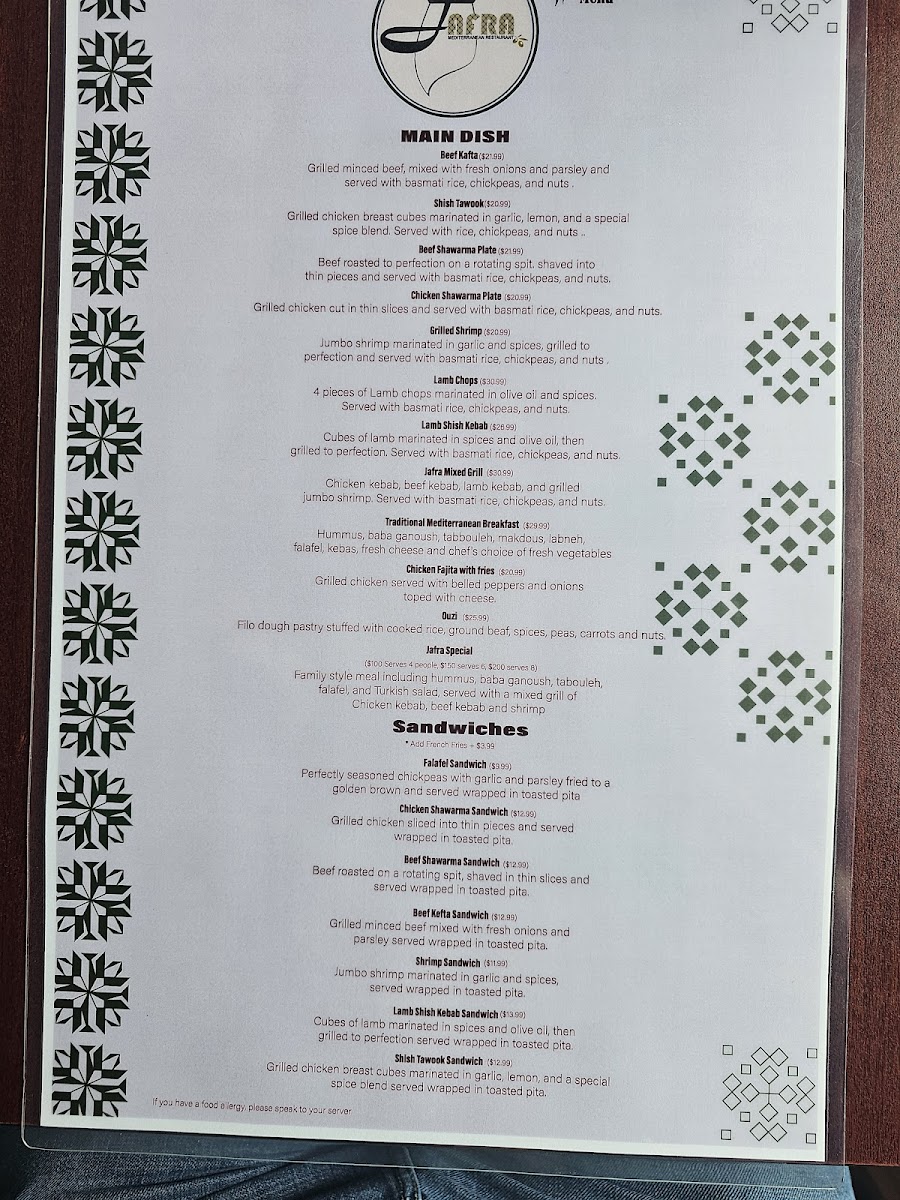 Beef roasted on a rotating spit, shaved in thin slices, and served wrapped in toasted pita with onions, pickles, tomatoes.